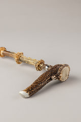 This walking stick stands out for its stag antler handle, shaped to offer perfect balance and comfort, and for the roe deer pattern that enhance its natural and authentic character. The decorative plaque adds a touch of distinctive refinement, enriching the warm simplicity of the wood with luminous, precisely crafted details.