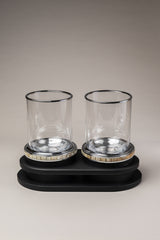 Un dettaglio in corno di zebù, dalle venature naturali e irregolari, aggiunge un accento caldo e materico, mentre la superficie liscia e impeccabile della pelle si abbina alla trasparenza raffinata del cristallo, in un dialogo di materiali che esalta il piacere del servizio e la cura del dettaglio.
