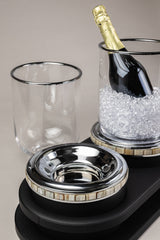 Sintesi di eleganza e funzione, il vassoio in vitello nautico accoglie una coppia di glacette removibili in cristallo, pensate per mantenere alla giusta temperatura più bottiglie nello stesso momento.