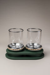Un dettaglio in palco di cervo naturale introduce una nota autentica e scultorea, mentre la superficie liscia e impeccabile della pelle si abbina alla trasparenza raffinata del cristallo, in un dialogo di materiali che esalta il piacere del servizio e la cura del dettaglio.