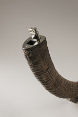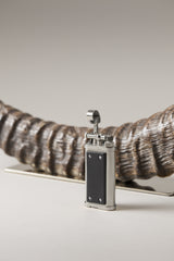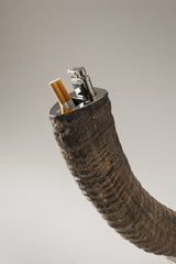 A unique complement, an object born as an 'accessory' to expand, with great majesty, its extent within a room. The untouched entirity of the Sand Antelope horn leans on a nickel-plated brass plate to rise up to an incomparable desk cigarette holder. The reusable Corona pocket lighter has a mechanical flint ignition system. The case is decorated with Zebu horn details which give it a rough and warm vibe.