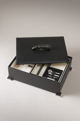 Within this refined casket with handles and feet made of Springbok horn, some tools for the maintenance of watches and glasses are also included.