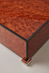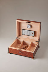 It is equipped with a humidifier and hygrometer that measures the percentage of humidity and is veneered externally in polished Amboyna burl wood, which is also used to decorate the four stainless steel feet.