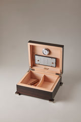 It is equipped with a humidifier and hygrometer that measures the percentage of humidity and is veneered externally in polished Makassar Ebony, which is also used to decorate the four stainless steel feet.