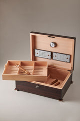It is equipped with a humidifier and hygrometer that measures the percentage of humidity and is veneered externally in mat Rosewood, which is also used to decorate the four stainless steel feet.
