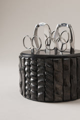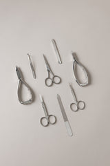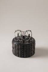 An ebony disc inside of which the most refined of routines finds the perfect and harmonic placement. The covering of the manicure set is made of dark and primitive Oryx horn and consists of a shining equipment in stainless steel composed of: cuticle scissors, nail scissors, nail file, cuticle and nail nipper, hair tweezers, nail cleaner, and round point scissors.