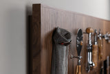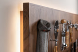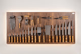 Like a curtain that opens to reveal the tastiest of stages, this wall-mounted knife holder is designed for those who see cooking as the finest of all arts. Made of Canaletto walnut wood, the panel board features engraved descriptions of each of the twenty-seven tools it houses, holding them with hidden magnets for a sleek and functional design. The board is equipped with wall-wash lighting, which is turned on by pressing a hidden switch to create a warm glow. Without any doors or closing panels, this completely open version makes the knife holder great for daily use. The set consists of: a curved paring knife, a straight paring knife, a sausage knife, a filleting knife, three cook knives, a boning knife, a spatula, a fork, a bone splitter, a steel, two knives for the roast, a bread knife, a ham knife, a corkscrew, kitchen scissors, parmesan knife, an oyster opener knife, an oyster glove, a nutcracker, a chicken shredder, a truffle cutter, a potato peeler, a bottle opener and a tomato knife. All blades are made of mirror-polished stainless steel with bamboo roots.