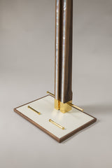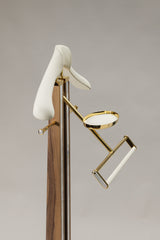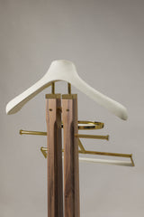 A discreet support for the daily dressing ritual, the valet stand is a cornerstone within the classic wardrobe. Its humble and essential nature makes it adaptable to uses and locations. it wears colours and natural features and becomes a garment holder in solid walnut wood, equipped with two spaces to hang ties or belts, a trousers holder with a leather detail in order for the fabric not to slip and a couple of metallic supports to store shoes without the risk of of soiling the base. Base and coat hanger are covered in nautical leather, while the structure and the metal details are made of golden brass, further lightened up by the preciousness of the vertical inserts in white or gray mother-of-pearl.