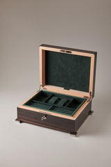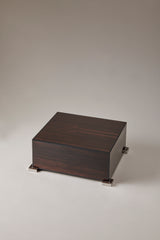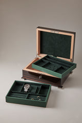 Like a precious seashell, the jewellery box is veneered in polished Makassar Ebony with stainless steel feet decorated in the same precious wood essence. Inside, the trays in soft Alcantara house 2 watch holders, a ring and cufflink holder, compartments for bracelets and accessories, and a brooch holder. Its interior can be taken out and used as an elegant trinket box or valet tray, perfect for your most precious items.