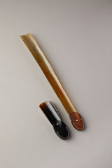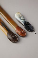 Our flat shoehorn, crafted from Zebu horn, boasts an air of sophistication and elegance, designed to command the attention it deserves. The finely crafted leather handle complete with a loop for easy hanging, not only adds practicality but transforms the shoehorn into a refined decorative piece for the wardrobe or shoe rack when not in use.