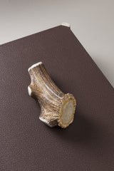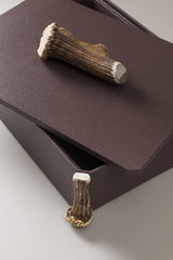 The deer or roe deer antler is a rather resistant material, both to shocks and to temperature and humidity changes. Nonetheless, as it is a natural substance, its color could fade, and it might lose its original shine over time, especially as regards those objects which often come in contact with water. In case of dehydration we recommend a periodic application of a thin layer of ecological linseed oil or Vaseline, using a dry cotton cloth. The leather employed for the manufacturing of this object is rather sturdy and does not have particular maintenance issues. If required, it may be taken care of with a nourishing balm.