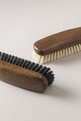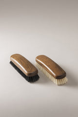 The precious Ovangkol wood, naturally polished with beeswax, is the material which crowns the fundamental shoe care tool; the brush in medium-rigid white or black pig bristle is the ideal ally for the removal of dust or dirt from footwear.