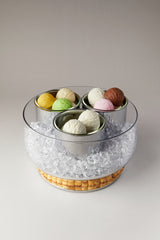 Our large glass bowl, set on an exquisite Bamboo base, is thoughtfully designed to hold ice, ensuring the ice cream remains fresh and perfectly chilled. Inside the main bowl, three elevated bowls in chromed brass each feature a removable glass insert, making them both dishwasher-safe and easy to clean.