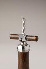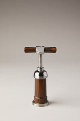 An object which enshrines its purpose between precious walls; the bell corkscrew has its body coated in wood, finished in an unrepeatable manner to cover sartorially its turned stainless steel spiral.
