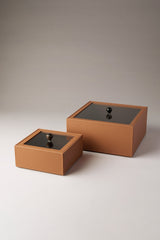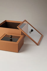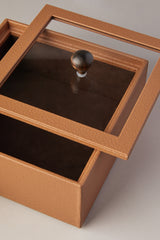 Not all objects come with cases meticulously tailored to their forms, but that hardly diminishes their value. In fact, it can make them even more precious. Such items find a unique and distinguished home within this finely crafted leather-covered container box, adorned with a wooden knob and framed in leather. The tempered glass lid, like a refined miniature showcase, is designed to both protect and beautifully highlight the contents within.