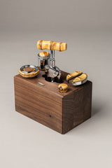 The cube-shaped box in Black walnut, with compact and elegant lines, holds a selection of essential accessories for the perfect tasting experience: double-lever corkscrew, conical wine bottle cap, champagne stopper, drip saver, and foil cutter — all crafted in chrome-plated brass enriched with elements crafted in bamboo root.