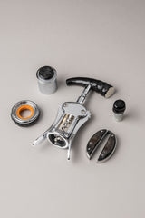 The cube-shaped box in black walnut, with compact and elegant lines, holds a selection of essential accessories for the perfect tasting experience: double-lever corkscrew, conical wine bottle cap, champagne stopper, drip saver, and foil cutter — all crafted in chrome-plated brass enriched with elements in springbok.