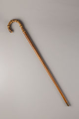 The curved wooden walking stick stands out for the smooth, organic lines of its bamboo root handle, shaped to offer perfect balance and comfort. The decorative plaque adds a touch of distinctive refinement, elevating the warm simplicity of the wood with luminous, precisely crafted details.