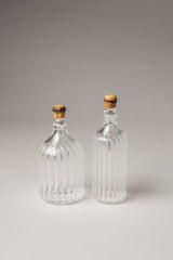 Le bottiglie in vetro rigato custodiscono questa dualità con una purezza quasi rituale, mentre il tappo in radice di bambù, levigato e modellato a mano, introduce una nota organica e luminosa.