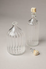 Le bottiglie in vetro rigato custodiscono questa dualità con una purezza quasi rituale, mentre il tappo in zanna di facocero, scultoreo per natura e ricco di forme inattese, conferisce una presenza forte e raffinata.