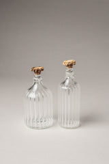 La loro natura li rende capaci di completare la tavola con gusto. Perfettamente simbiotici ma sottilmente distinti, olio e aceto dialogano su due righe separate, compiendo un’armonia che merita un contenitore all’altezza. Le bottiglie in vetro rigato custodiscono questa dualità con una purezza quasi rituale, mentre il tappo in capriolo, lavorato su misura, aggiunge una nota materica e irripetibile. Un equilibrio di forme, funzioni e sensazioni che nasce dalla mano dell’artigiano.