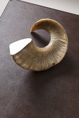The Ram horn is a rather resistant material, both to shocks and to temperature and humidity changes. Nonetheless, as it is a natural substance, it might lose its original shine over time, especially as regards those objects which often come in contact with water. In case of dehydration we recommend the periodic application of a thin layer of ecological linseed oil or Vaseline, using a dry cotton cloth. Washing, when required, must be done by hand, with lukewarm water and mild detergents. Do not leave the material to soak and dry it thoroughly before storing it. The leather employed for the manufacturing of this object is rather sturdy and does not have particular maintenance issues. If required, it may be taken care of with a nourishing balm.