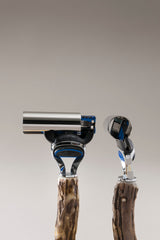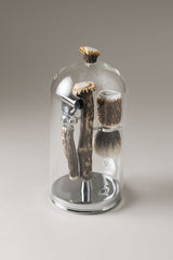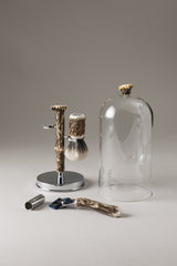 A special showcase for extraordinarily daily objects; a bell made of blown glass with a deer antler knob holds the shaving set, while protecting and preserving it in a perfectly dry place. The Gillette Fusion razor and the badger hair shaving brush have the handle made of the same precious material, as well as the frame which supports them, thus creating an ideal dimension of rustic inspiration.
