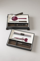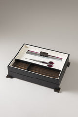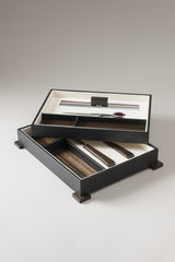 The double desk set is realized around the warm inspiration typical of the exotic landscapes, in leather with Alcantara bottom, with Makassar ebony inserts and a set which includes a chrome-plated brass ruler, stainless steel scissors, a lens and a paper knife with handle in the same precious wood, its support feet and special accessories are made of the same material.