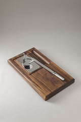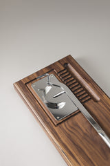 A unique tool, exclusively dedicated to treating with the proper devotion such a precious gift from the sea; the table oyster opener consists of a stainless steel removable plate and bar to allow the positioning, opening and collection of the water stemming from this valuable shellfish. The base in Canaletto walnut is equipped with four suction cups which ensure stability on the worktop. A refined and surprising shape that catches the eye before the taste.