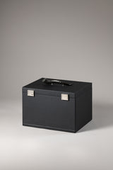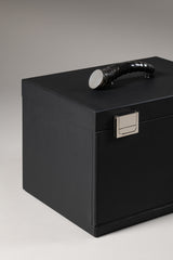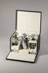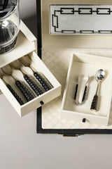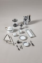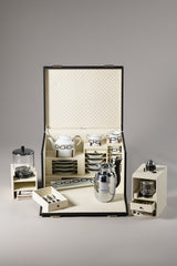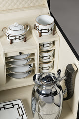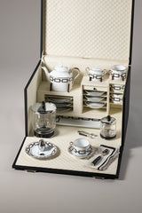 An ancient, essential ritual, tea is an 'exported' luxury. This set is stored in a black marine calfskin case with a springbok horn handle and includes an Italian Richard Ginori porcelain set with chain decoration designed by Gio Ponti in 1926 (teapot, sugar bowl, rectangular tray, 4 teacups with saucers, 4 cookie trays) The set includes 4 teaspoons with springbok handles, small sugar cube tongs, a sugar spoon, 2 glass containers with oryx horn knobs, 4 napkins and a pure cotton tablecloth with handmade embroidery, a glass jug with a springbok handle.