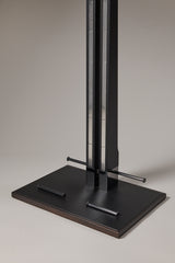 A discreet support for the daily dressing rite, the valet stand is a cornerstone within the classic wardrobe. Its humble and essential nature makes it adaptable to uses and locations. In its official version, it wears colours and natural features and becomes a garment holder in dark tinted solid mahogany wood, equipped with two spaces to hang ties or belts, a trouser holder with a leather detail so that the fabric does not slip and a couple of metallic supports for the stashing of shoes without the risk of soiling the base. Base and hanger are covered in vegetable-tanned sole leather, the vertical inserts are embellished by the damascus.