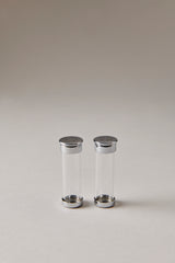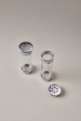 The salt and pepper sprinkle set is made of glass and chrome plated brass, which defines its identity.