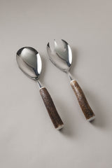 Una cultura che non accetta compromessi; la tavola è un campo di gioco con dettami e regole ben precise. La mise en place riveste un ruolo decisivo che non transige su varietà e metodologie dei suoi principali strumenti: le posate. La coppia da insalata in acciaio inossidabile svetta su un'impugnatura in palco di cervo che ne avvolge le aderenze alla perfezione.