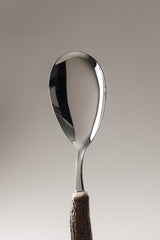 Una cultura che non accetta compromessi; la tavola è un campo di gioco con dettami e regole ben precise. La mise en place riveste un ruolo decisivo che non transige su varietà e metodologie dei suoi principali strumenti: le posate. La pala da riso in acciaio inossidabile svetta su un'impugnatura in palco di cervo che ne avvolge le aderenze alla perfezione.