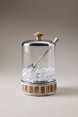 Realizzato in vetro soffiato, con coperchio in ottone cromato, è reso unico dai preziosi dettagli in palco di cervo, artigianalmente lavorato. Il coperchio è pensato per ospitare perfettamente la pinza per il ghiaccio, mentre sul fondo una placca in ottone cromato perforato consente di filtrare l'acqua tenendola separata dal ghiaccio.