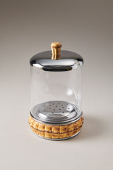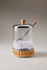 Realizzato in vetro soffiato, con coperchio ottone cromato, è reso unico dai preziosi dettagli in radice di bambù, artigianalmente lavorata. Il coperchio è pensato per ospitare perfettamente la pinza per il ghiaccio, mentre sul fondo una placca in ottone cromato perforato consente di filtrare l'acqua tenendola separata dal ghiaccio.