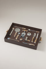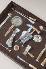 Un set non soltanto a misura di intenditore; il vassoio in legno ricoperto in pelle Saffiano è realizzato per contenere ed ospitare sartorialmente tutti i suoi accessori, che resi unici dalla particolarità del materiale naturale, trovano all'interno della morbida Alcantara la propria sagomata forma. Composto da cavatappi 2 leve, levacapsule, tappo e pinza per champagne, pestello per zucchero, cucchiaio da cocktail, pestello da