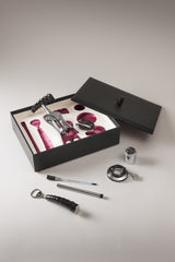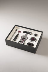 Un'elegante scatola in legno ricoperta in pelle Saffiano è l'ideale vassoio di un set da vino raffinato ed essenziale, un gioiello destinato ad un pubblico di intenditori che include: cavatappi due leve cromato, tagliacapsule, termometro da vino in contenitore cromato, levacapsule, tappo e pinza per champagne.