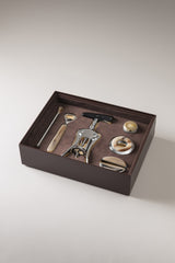 Un'elegante scatola in legno ricoperta in pelle Saffiano è l'ideale vassoio di un set da vino raffinato ed essenziale, un gioiello destinato ad un pubblico di intenditori che include: cavatappi due leve cromato, tagliacapsule, termometro da vino in contenitore cromato, levacapsule, tappo e pinza per champagne.