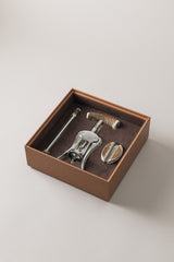 Un pensiero speciale da donare o custodire per un'occasione importante. Un prezioso cofanetto che riprende nelle tonalità il materiale protagonista; il set da vino incarna le aspre suggestioni del palco di cervo, utilizzato per assecondare artigianalmente le dimensioni dei dettagli cromati del cavatappi due leve, il tagliacapsule ed il termometro da vino.