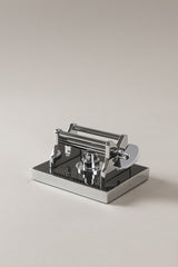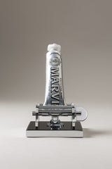 Un meccanismo tanto elegante da riuscire difficilmente ad immaginarne una collocazione nella stanza da bagno. Il misterioso oggetto in ottone cromato che poggia su di una base in fibra di carbonio, fredda e maschile, nasconde sotto un'enigmatica estetica la sorprendente natura della sua utilità; la rotazione dello spremi tubetto permette di beneficiare completamente della quantità di dentifricio senza sprecare prodotto.