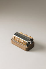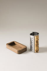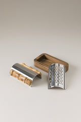 Un gesto che è preludio all'atteso momento della giornata dedicato alla buona tavola. Un oggetto che coniuga funzionalità ed estetica; la grattugia in acciaio inossidabile è removibile, per permetterne una pulizia ottimale, i particolari sono realizzati in radice di bambù. Il finish classico viene reso grazie al vassoio in legno Iroko rifinito con olio di lino.