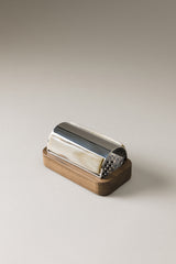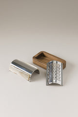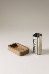 Un gesto che è preludio all'atteso momento della giornata dedicato alla buona tavola. Un oggetto che coniuga funzionalità ed estetica; la grattugia in acciaio inossidabile è removibile, per permetterne una pulizia ottimale, i particolari sono realizzati in corno di Zebù. Il finish classico viene reso grazie al vassoio in legno Iroko rifinito con olio di lino.