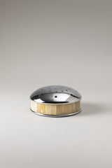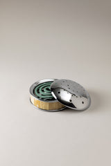 Un contenitore in ottone cromato rivestito da placchette in corno di zebù diventa elegante 'ambasciatore' di un oggetto tanto esteticamente trascurato quanto concretamente insostituibile; il porta zampirone acquista ruolo e posto d'onore grazie al supporto interno che sostiene la spirale d'incenso ed il coperchio forato che ne consente la diffusione, mantenendola segretamente custodita.