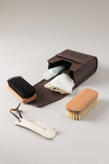 Specialmente se di alta manifattura, la calzatura esige una manutenzione che non può limitarsi ai confini dell'ambiente domestico. I suoi strumenti sono tradizionalmente unici e la loro versione ridotta trova spazio all'interno del set scarpe da viaggio in soffice nappa: due spazzole in legno di pero e setole naturali (bianca e nera), un mini calzante di corno, crema lucidante e panno da Sciuscià.