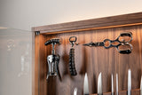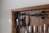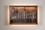 Come un sipario che si apre sul più gustoso dei palcoscenici, il pannello da coltelli è pensato per chi vive la cucina come la più suprema delle arti. Realizzato in noce canaletto con le descrizioni di ognuno dei sedici utensili impresse nel legno, permette di esporli con un sistema di calamite nascoste esteticamente funzionale. E’ possibile personalizzare l’illuminazione del pannello a partire da una soluzione wall wash, da atmosfera, diffusa su parete, oppure una luce interna che illumina completamente il set. Entrambe le accensioni sono regolabili da due diversi interruttori. La coltelliera è chiusa da due ante a battente di vetro, in modo che il set rimanga visibile ma al contempo protetto. Il set è composto da: un pelapatate, uno spelucchino curvo, un coltello da verdure, un coltello dentato per agrumi, un coltello per disossare, un coltello per salumi, un forchettone, un acciaiolo, un coltello per carne cruda, un coltello per arrosti, un coltello da pane, un coltello da chef’s, un coltello flessibile a punta per prosciutto, un cavatappi a due leve, un levacapsule e un paio di forbici da cucina. Tutte le lame sono forgiate in acciaio inossidabile lucidate a specchio con impugnature in vigoroso corno di Springbok.