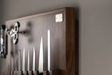 Come un sipario che si apre sul più gustoso dei palcoscenici, il pannello da coltelli è pensato per chi vive la cucina come la più suprema delle arti. Realizzato in noce canaletto con le descrizioni di ognuno dei sedici utensili impresse nel legno, permette di esporli con un sistema di calamite nascoste esteticamente funzionale. Il pannello è dotato di illuminazione wall wash, da atmosfera, la cui accensione è regolata da un interruttore nascosto. La versione della coltellieria completamente aperta, senza alcun tipo di chiusura, si presta per un utilizzo quotidiano. Il set è composto da: un pelapatate, uno spelucchino curvo, un coltello da verdure, un coltello dentato per agrumi, un coltello per disossare, un coltello per salumi, un forchettone, un acciaiolo, un coltello per carne cruda, un coltello per arrosti, un coltello da pane, un coltello da chef’s, un coltello flessibile a punta per prosciutto, un cavatappi a due leve, un levacapsule e un paio di forbici da cucina. Tutte le lame sono forgiate in acciaio inossidabile lucidate a specchio con impugnature in vigoroso corno di zebù.