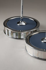 L'estetica richiede controllo e cura estrema dei dettagli, azioni delle quali lo specchio diviene simbolo, riflettendone importanza e qualità. Lo specchio ingrandente (x3) è interamente rivestito in vitello nautico e può essere ruotato sul piano sia verticale che orizzontale grazie al meccanismo integrato. La base è caratterizzata dalla decorazione con piccoli listelli in madreprla, che lo rendono un complemento dalla natura eccentrica e tenace. NOTA: Sebbene la madreperla sia un materiale non soggetto a CITES, per le spedizioni internazionali la dogana potrebbe approfondire con ulteriori accertamenti, influendo sui tempi di consegna.