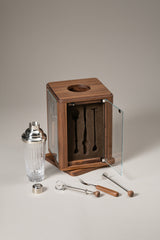 Una ritualità da condividere in momenti e con persone speciali; il ceppo bar girevole in noce canaletto racchiude come un raffinato forziere i principali alleati per la preparazione di drink a regola d'arte. Al centro lo shaker in vetro e ai lati un leva capsule, un pestello per lo zucchero, un pestello per il ghiaccio, un coltello a 3 punte, una forchetta bar, una pinza da ghiaccio, uno sbuccia limoni, un pin champagne, un cucchiaio da bar, un tappo e un misurino. Le 4 ante in vetro temperato bisellato ai bordi si aprono con un sistema push and pull capace di rivelare, in un attimo, tutto ciò che serve a celebrare la convivialità.