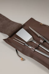 Utensili dal fine particolare, indirizzati a precisi contesti, da sfoderare quando clima e compagnia lo consentono. Il barbecue non è soltanto un metodo di cottura, ma occasione speciale di condivisione di gusto e suggerimenti che richiede un know how specifico. il set contiene: spatola, forchettone e coltello